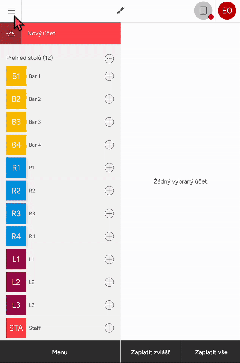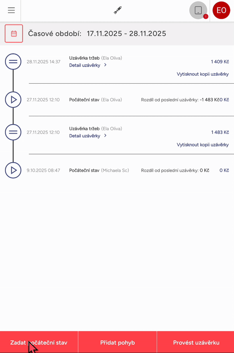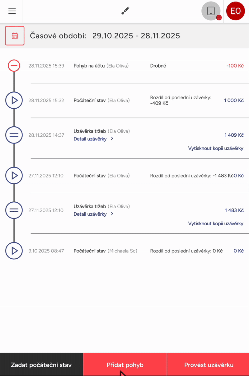 Pohyb hotovosti najdete na hlavním zařízení v Menu ≡. Může zde zadat počáteční stav pokladny, přidat pohyb - vložení nebo výběr hotovosti i uvedením důvodu, a udělat uzávěrku či vytisknout její náhled.