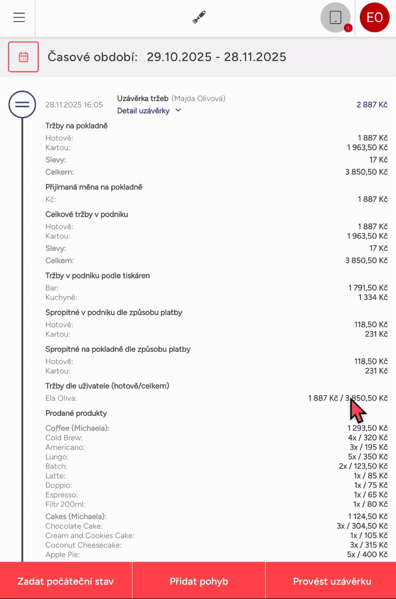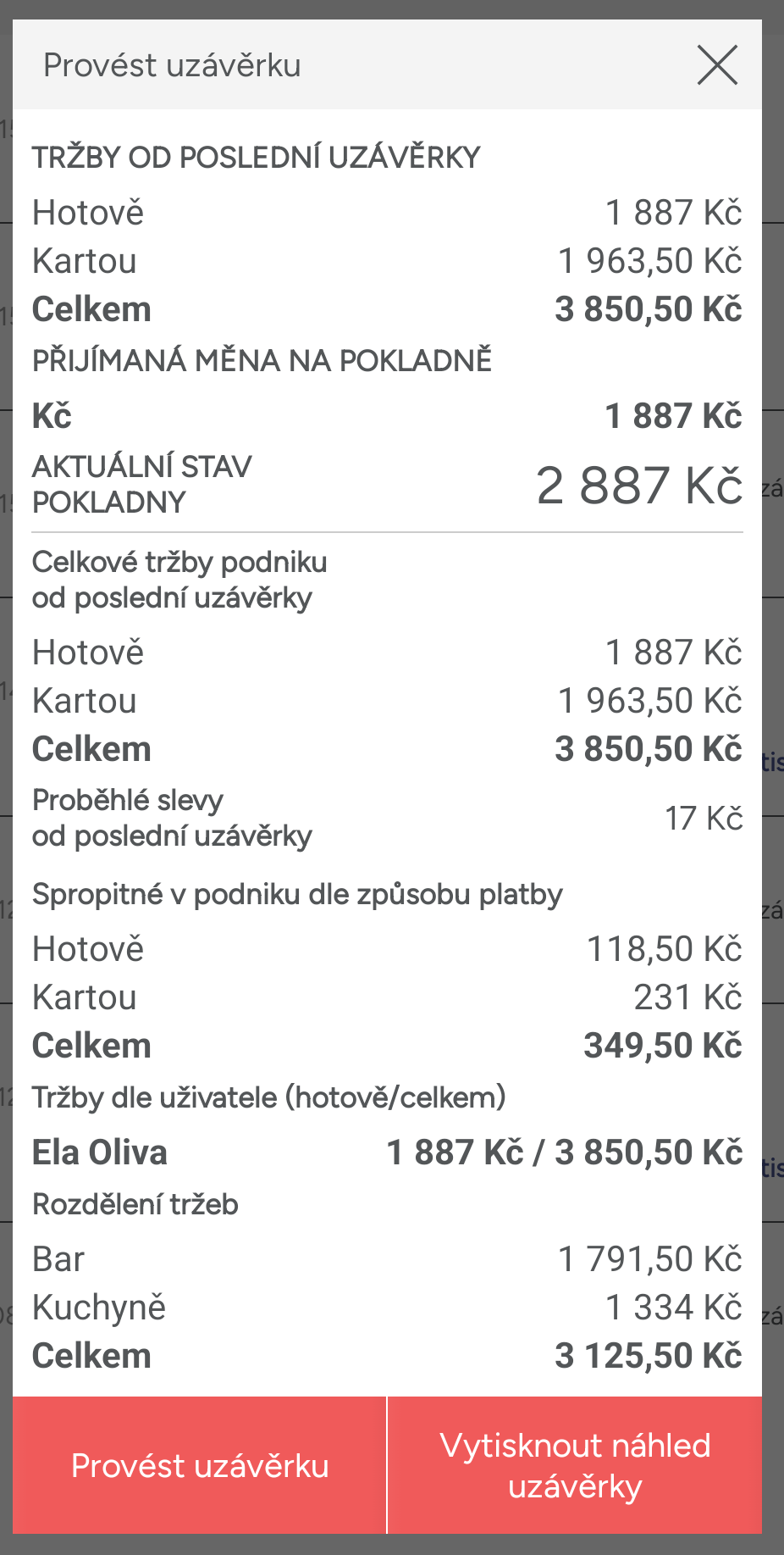 Na náhledu uvidíte tržby rozdělené podle typu plateb, přijaté měny (tuto funkci vám může aktivovat naše podpora), aktuální stav poklad (počáteční stav společně s tržbou a vklady, případně poníženo o výběry).