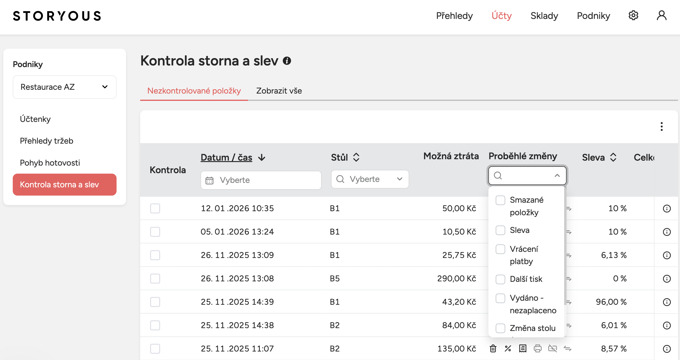 V části Kontrola storn a slev se zobrazují všechny nestandardní operace, které proběhly na pokladně – například smazané položky, stornované účty, vrácené platby, další tisky účtenek nebo udělené slevy.