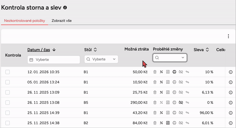 Když danou operaci prověříte (například jste si ověřili, proč byla udělena sleva nebo smazána položka), můžete ji označit jako zkontrolovanou zaškrtnutím políčka v prvním sloupci.