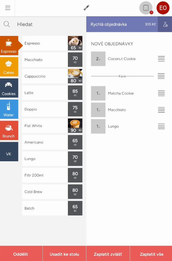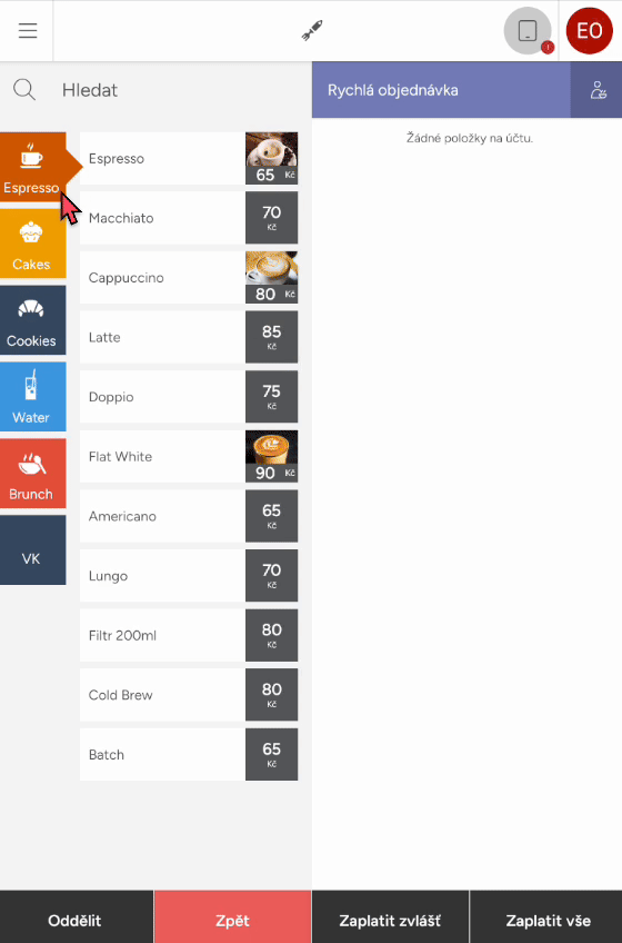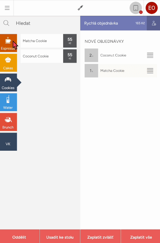 Po vybrání stolu nebo vytvoření rychlé objednávky se přesunete do objednávkového módu, po levé straně naleznete nabídku produktů rozřazených podle kategorií, kliknutím na kategorii, se vám zobrazí produkty, které klepnutím objednáte. Účet, na který objednáváte, se vám zobrazí na pravé straně.