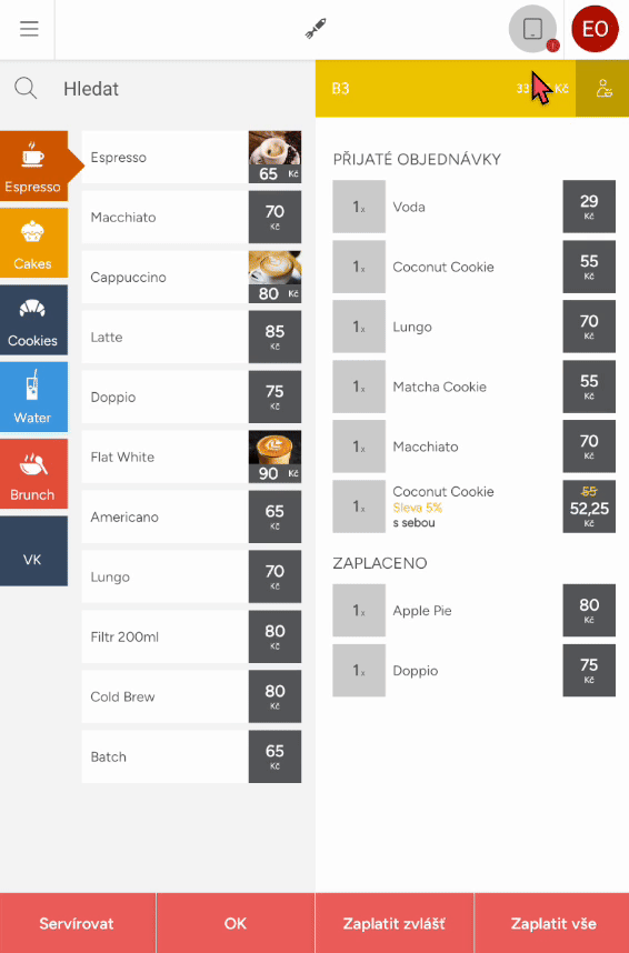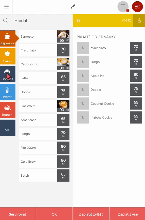 Při přidání dalších objednávek na již otevřený účet systém rozlišuje, které položky byly dříve přijaté, které jsou namarkované nově a které byly případně již zaplaceny.
