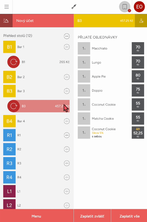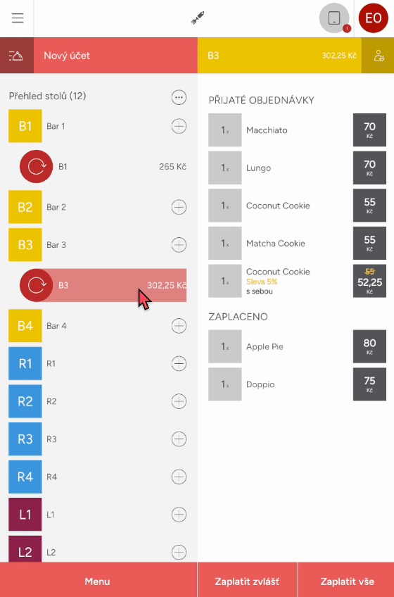 Po potvrzení objednávky můžete otevřený účet u daného stolu najít v přehledu stolů. Pokud na objednávku klepnete, vpravo naleznete již přijaté produkty, jestliže chcete na účet něco přidat, klikněte na danou objednávku nebo stiskněte tlačítko Menu. Přesunete se opět do objednávkového módu a můžete přidat další produkty.