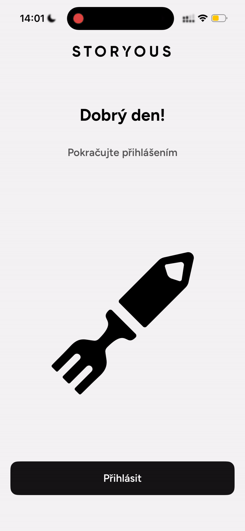 Otevřete aplikaci a klikněte na Přihlásit. Otevře se vám stránka pro přihlášení pomocí Teya ID. Použijte stejné uživatelské jméno a heslo jako do administrace Storyous.