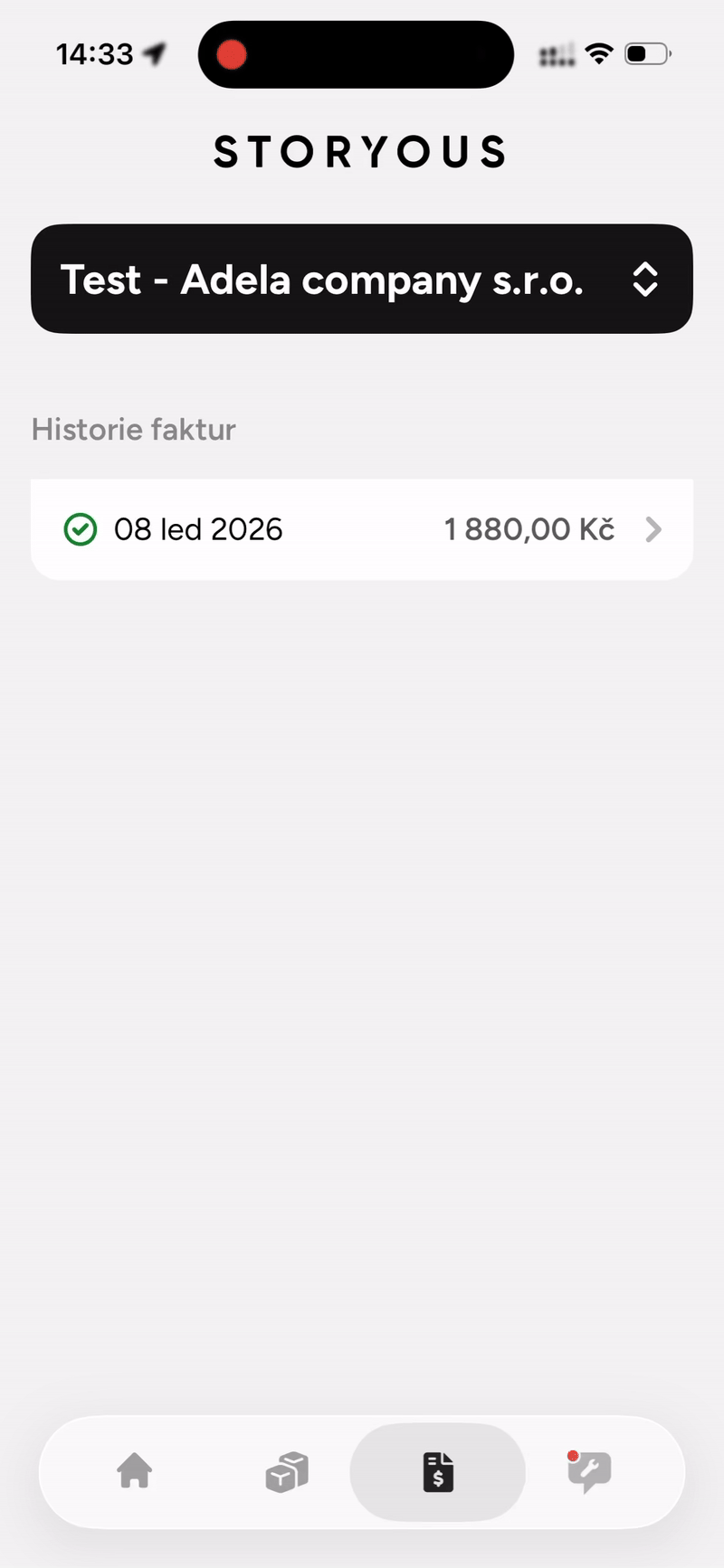 V této sekci najdete veškeré vystavené faktury, můžete si například zkontrolovat zda máte vše uhrazeno. Kliknutím na aktuálně vybranou společnost nahoře se můžete přepnout na další.