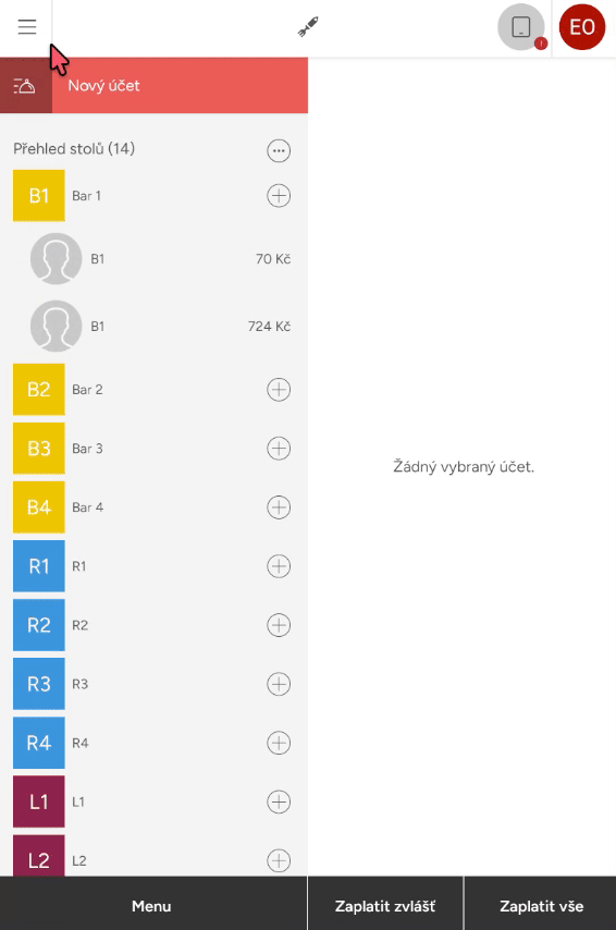 - Objednávku poté můžete odložit na stůl (můžete si vytvořit stůl Rozvoz nebo Vyzvednutí v administraci v sekci Podniky - Stoly) nebo ji rovnou zaplatit. Účet bude uložen pod jménem zákazníka.
