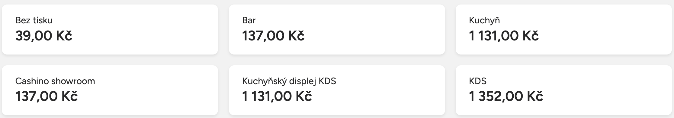 V tabulce se zobrazují všechny tiskárny, které máte v podniku nastavené, a pod každou z nich je uvedena celková částka, která představuje součet objednávek (bonů) odeslaných na danou tiskárnu.