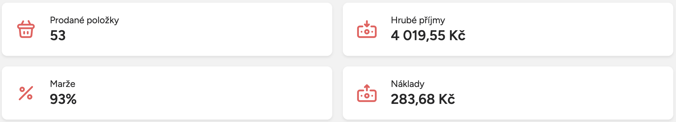 - Prodané položky – zobrazuje celkový počet všech prodaných produktů v daném období. Jedná se o součet všech položek na účtech, které byly uzavřeny a zaplaceny.