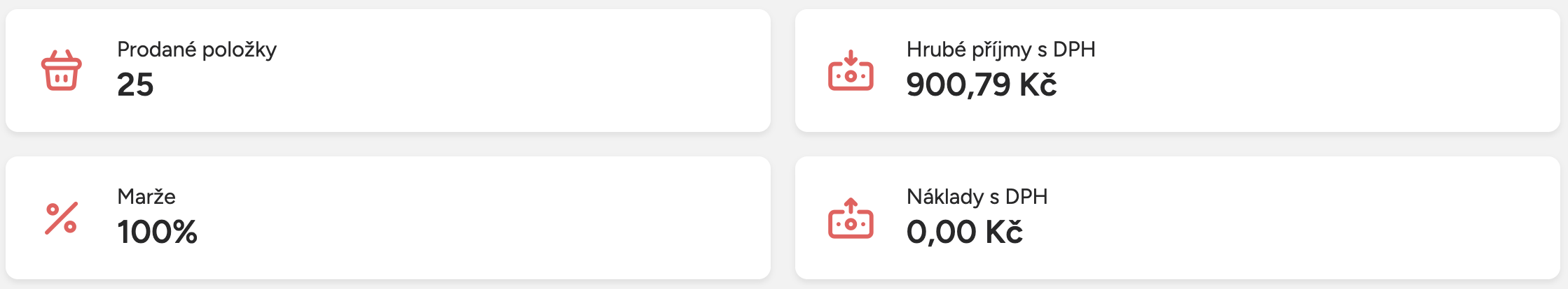 - Náklady s DPH – jsou nákupní ceny surovin a produktů se štítkem, které byly použity na všechny prodané položky ve zvoleném období. Hodnota se přebírá ze skladových karet a jejich nákupních cen v účetním období.