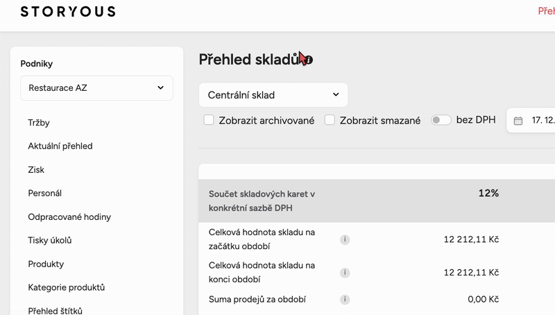 Přehled skladů slouží jako statistické zobrazení hodnoty skladových zásob a všech operací, které se na skladu uskutečnily ve zvoleném období. Pomáhá kontrolovat spotřebu, inventury, přeskladnění i rozdíly mezi skladem a prodejem na pokladně.