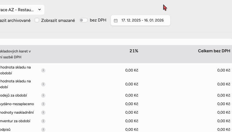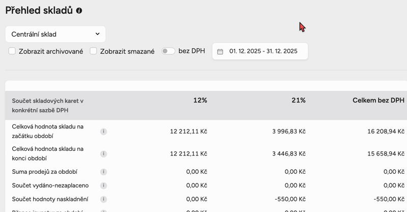 Údaje v přehledu jsou zobrazovány v nákupních cenách a slouží především ke kontrole skladového hospodářství, nikoli ke sledování tržeb.
