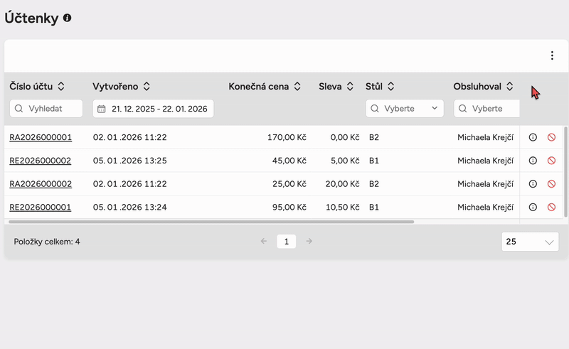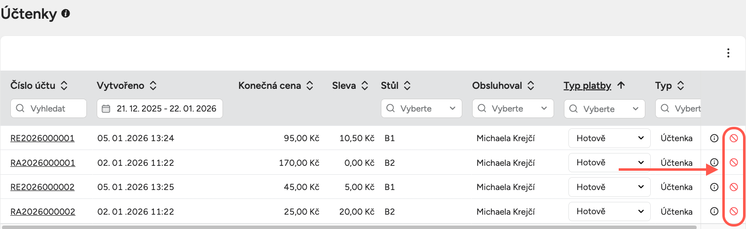 Smazání účtenky – dostupné pouze pro majitelskou roli. Účtenka se z přehledu úplně odstraní. Ikona pro smazání i storno se nachází vpravo na řádku dané účtenky.