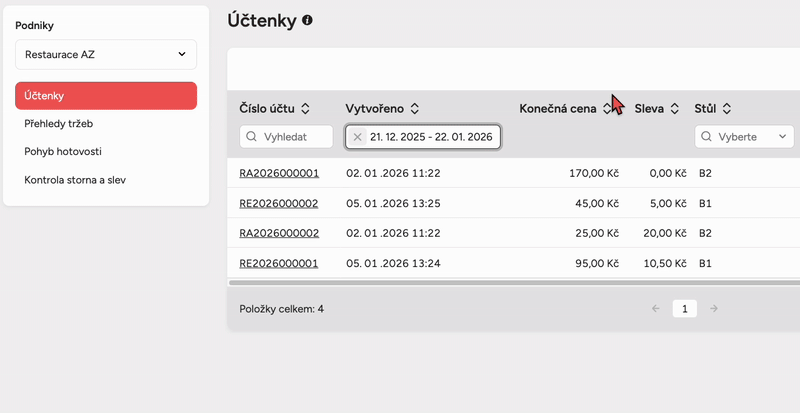• Zvolte datum od – do, za které chcete účtenky zobrazit. Po potvrzení se tabulka zúží jen na účtenky z daného období.