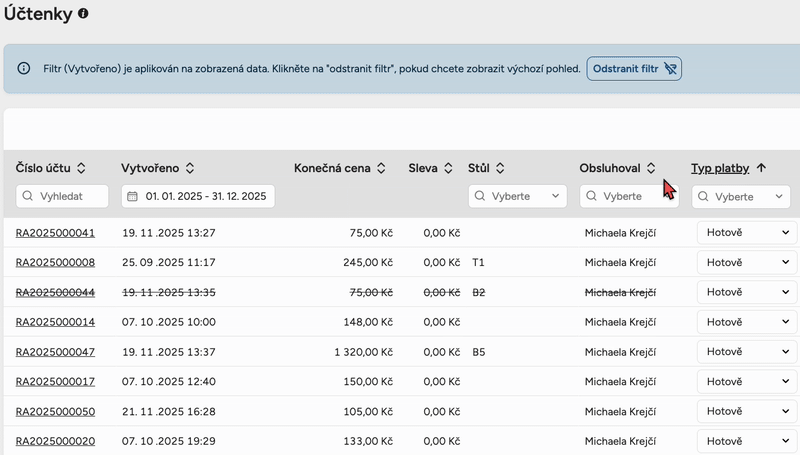 Pomocí filtrů tak můžete oddělit například jen externí objednávky zaplacené předem, které potřebujete předat účetní, nebo si rychle zobrazit účtenky konkrétní obsluhy.