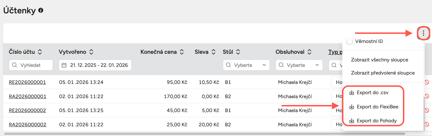 Všechny účtenky z webové administrace můžete exportovat, abyste je předali účetnictví nebo zpracovali v externím systému: