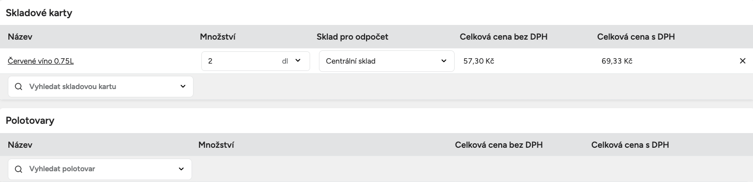 Pokud víte, že 1 láhev má 0,75 l, nastavíte ve skladové kartě přepočet jednotek z kusů na litry. V receptu na sklenku vína uvedete množství 0,2 l. I když máte víno naskladněné v kusech lahví, prodej sklenek se bude odečítat v litrech a systém správně dopočítá, kolik lahví se ve skutečnosti spotřebovalo.