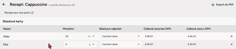 Recepty můžete jednoduše vyexportovat na kontrolu nákladů a marže mimo systém (např. v Excelu), nebo jako pracovní postup pro zaměstnance – PDF receptu s vyplněnou sekcí Postup, který může sloužit jako přesný návod, jak připravit konkrétní jídlo nebo koktejl krok za krokem.