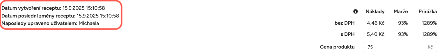 Tip: Ve spodní části detailu receptu najdete informaci Naposledy upravil uživatel – vidíte jméno uživatele a datum poslední úpravy.