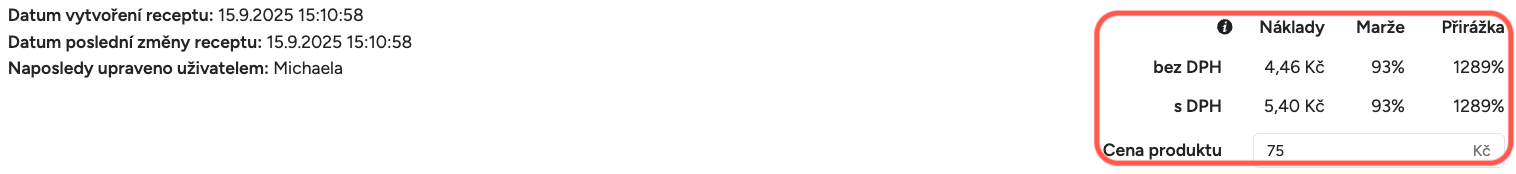 Ve spodní části detailu receptu najdete blok s přehledem nákladů a ziskovosti: