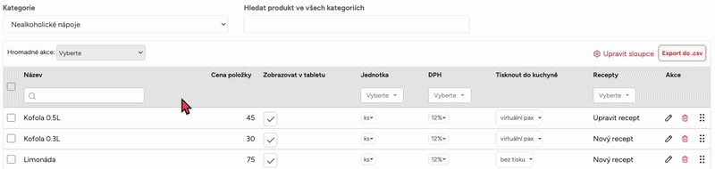| Upozornění: Pokud v tabulce produktů nevidíte sloupec Recepty, znamená to, že nemáte vlevo nahoře vybraný konkrétní Podnik, ale možnost Všechny podniky. Nejprve vyberte konkrétní podnik; teprve potom se sloupec Recepty zobrazí a můžete s recepty pracovat. |