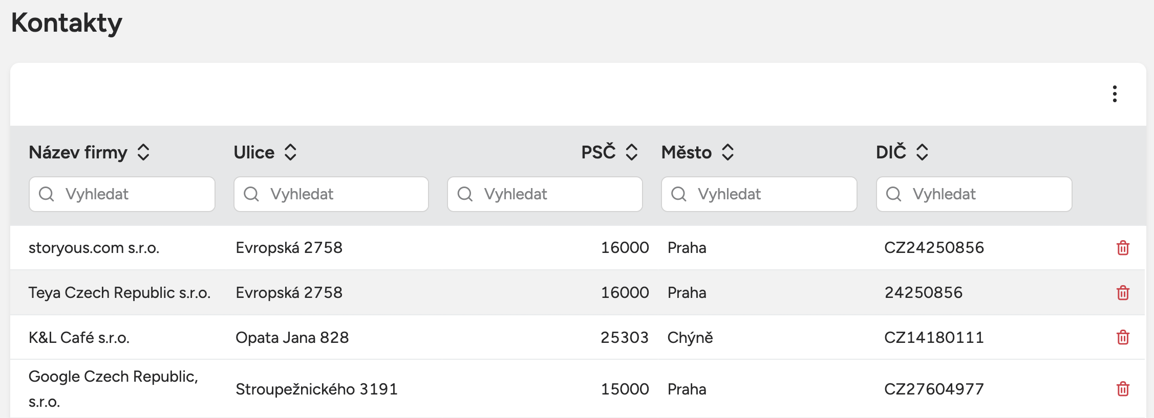 - vyhledávat kontakt podle názvu firmy, adresy nebo DIČ pomocí filtrů nad tabulkou,