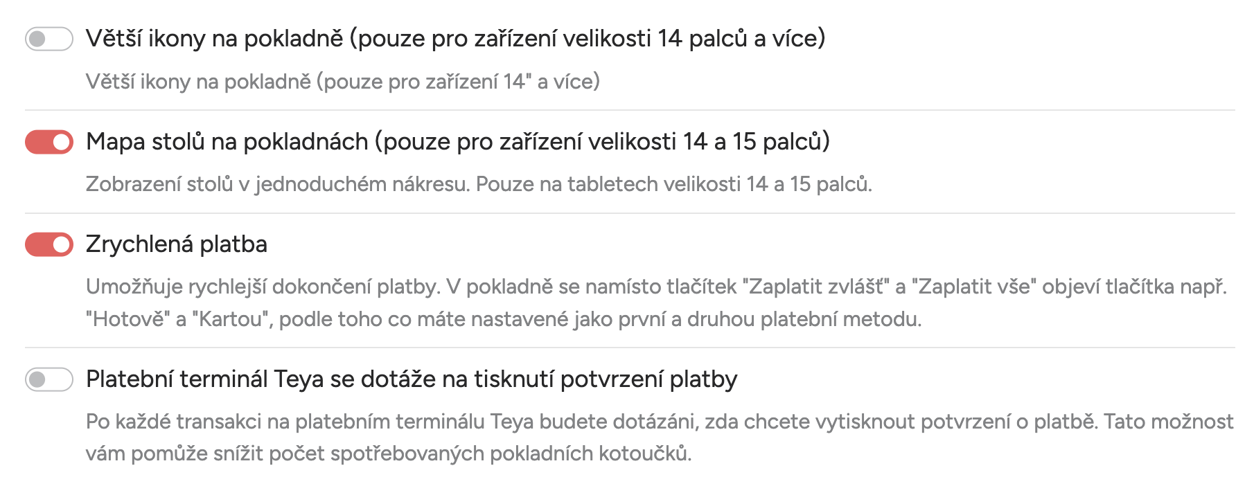 Jednoduše si přečtěte popis a aktivujte požadovanou funkci podle potřeby vašeho podniku. Chcete-li upravit některá nastavení pokladní aplikace, přejděte do Nastavení a vyberte možnost Nastavení pokladny.