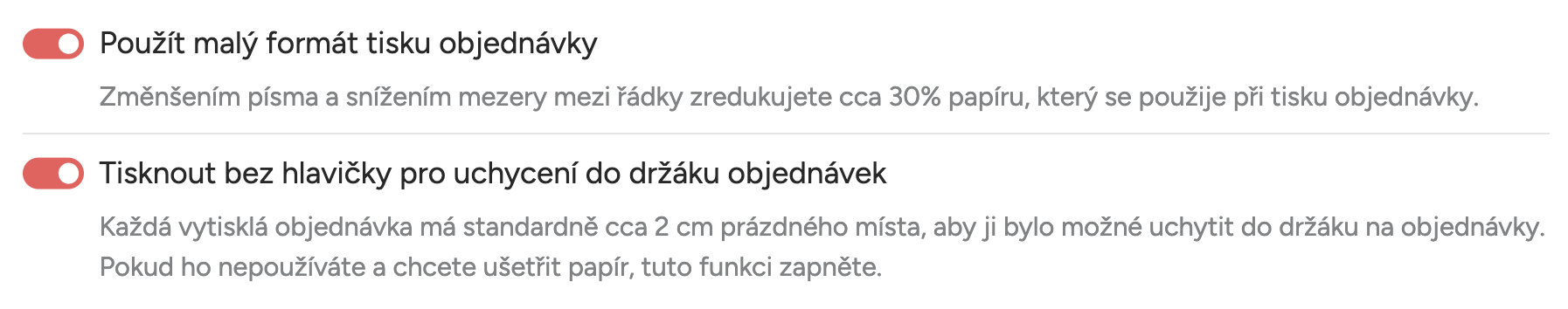 V této sekci si můžete nastavit tisk menšího formátu objednávek, který vám ušetří papír a pokud nepotřebujete na objednávkách prostor pro zasunutí do držáku objednávek, můžete si aktivovat funkci tisku bez hlavičky.