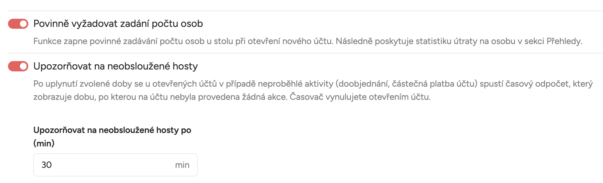 V úvodní části tohoto nastavení můžete povolit nebo zakázat funkce pro vaši pokladnu a proces objednávání. Máte například možnost si nastavit čas pro upozornění na neobsloužené zákazníky a nebo zapnout funkci pro zadávaní počtu osob při vytváření nové objednávky.