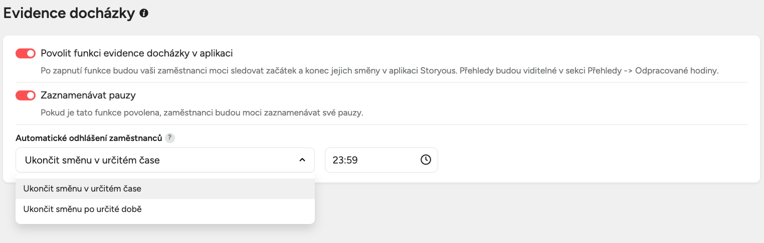 Funkci Docházka zaměstnanců můžete aktivovat nebo deaktivovat v nastavení: Nastavení → Evidence docházky. Pokud ji vypnete, možnost zaznamenávání příchodů a odchodů nebude dostupná.
