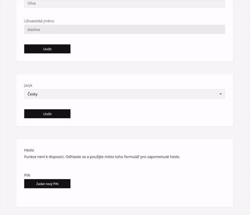 Ve webové administraci máte možnost si nastavit profilový obrázek, jméno, příjmení, jazyk a PIN. Do uživatelského nastavení se dostanete: