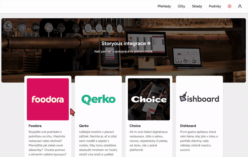 V sekci Storyous integrace ve vaší webové administraci najdete přehled vybraných partnerů, se kterými spolupracujeme. Na jednom místě si můžete prohlédnout nabídku integrací, aktivovat si je sami, bez potřeby kontaktovat naši podporu a nakonfigurovat je přímo ve svém systému.