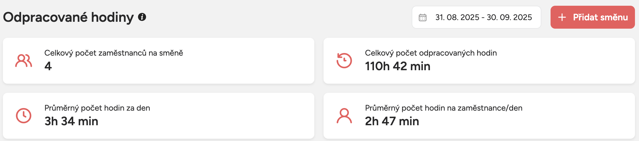V sekci Přehledy → Odpracované hodiny najdete detailní přehled směn vašich zaměstnanců – od celkového počtu odpracovaných hodin, přes průměrné hodnoty až po jednotlivé záznamy. Funkce vám pomůže jednoduše sledovat docházku a efektivitu týmu.
