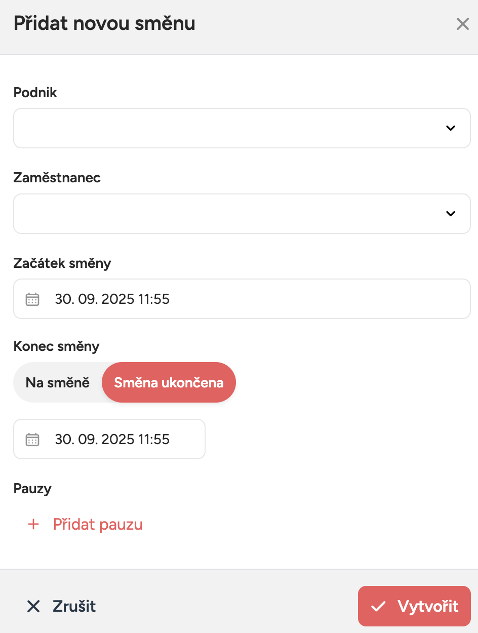 Novou směnu můžete přidat pomocí tlačítka + Přidat směnu v pravém horním rohu. To je užitečné například při manuálním doplnění docházky.