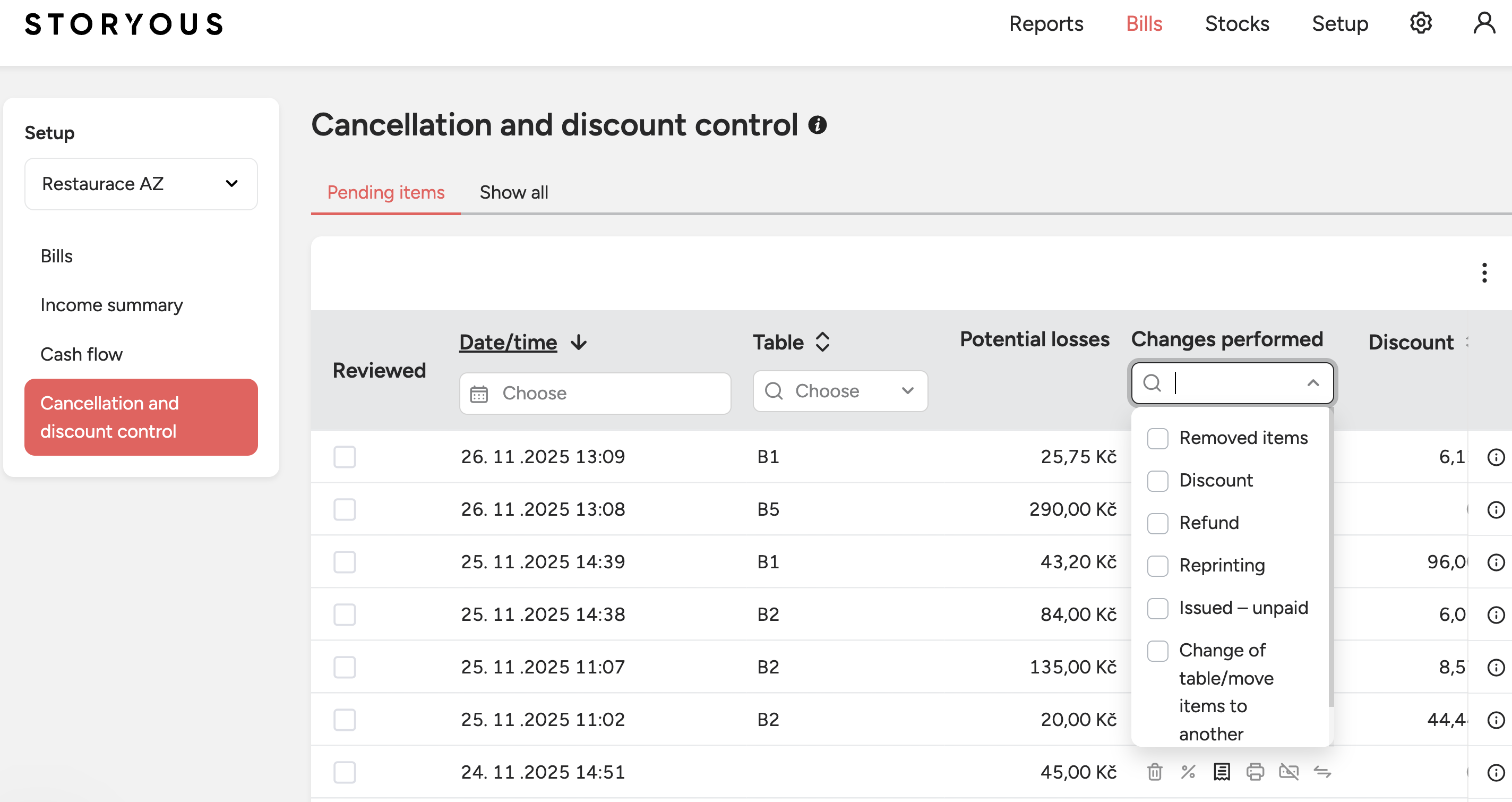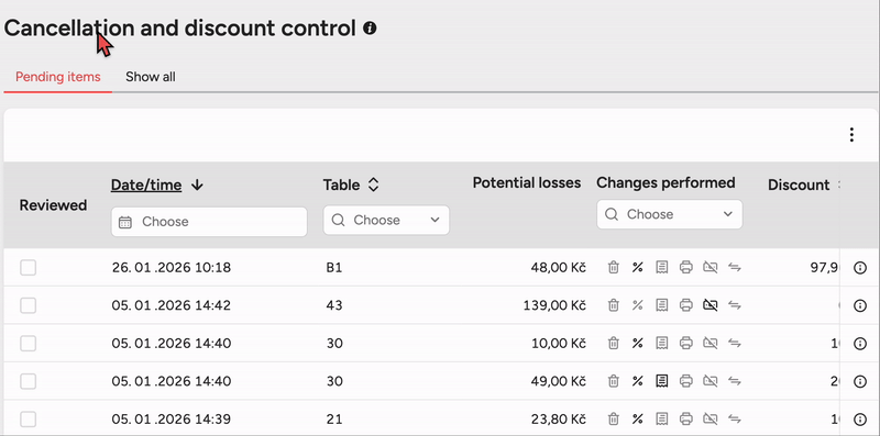 In the Control of Cancellation and discounts section, you can see all non-standard operations that took place on the POS – for example deleted items, cancelled bills, refunded payments, additional receipt prints or granted discounts.