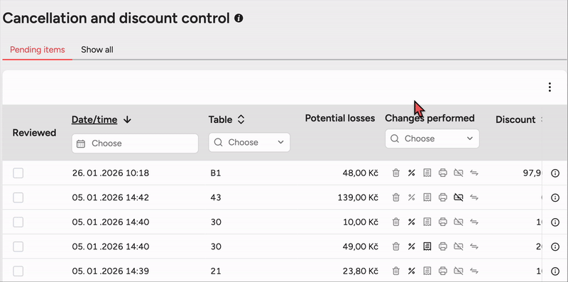 Once you have checked a specific operation (for example you have verified why a discount was given or an item was deleted), you can mark it as reviewed by ticking the checkbox in the first column.