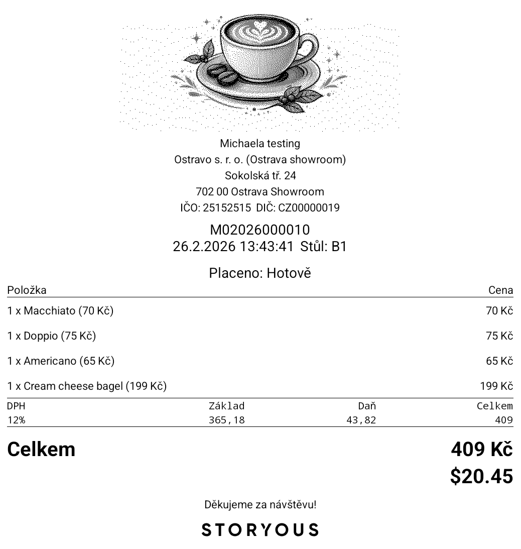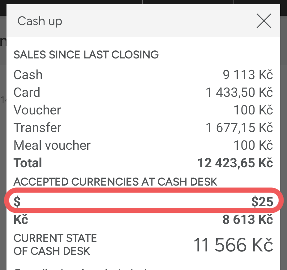 The Accepted currencies at cash desk includes only payments received in cash and is equal to the Sales since last closing – Cash. The calculation is as follows: 25 $ * 20 (exchange rate set in the administration) = 500 CZK + 8,613 CZK = 9,113 CZK.