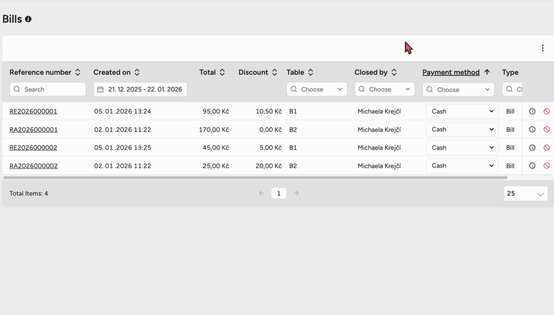 For cancellation, bill edits or payment type changes on already closed bills, you must always take fiscalisation into account on the Slovak market – we recommend following your internal accounting rules and the steps described in the separate Fiscalisation article.