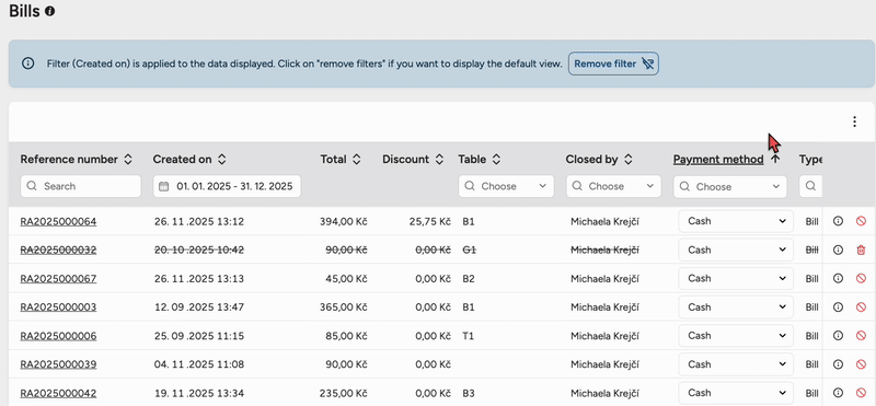 - You can filter bills by payment type, for example cash, card payment, invoice payment, prepaid payment (for example Wolt, Foodora if they are integrated with Storyous) or by other payment types you have created in your payment settings.