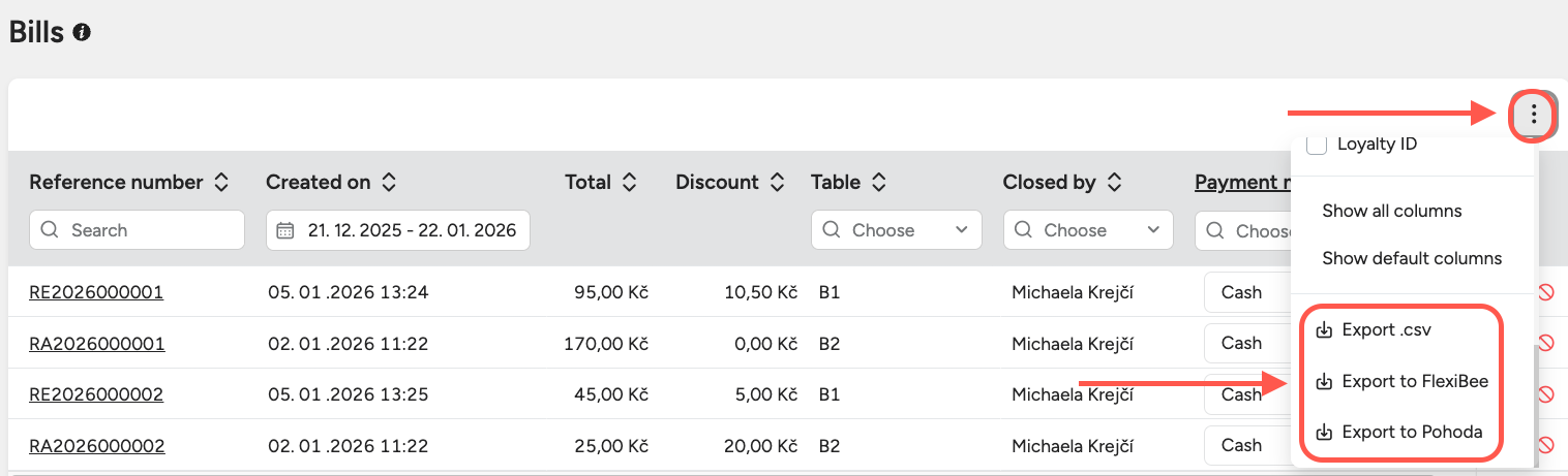 Export to Abra FlexiBee: if you use the Abra FlexiBee accounting system, you can export bills directly in a compatible format. Only the total amounts of bills and the corresponding VAT are exported, not individual items. You can find the exact steps in this article: Exporting Data to the Abra FlexiBee Accounting System.