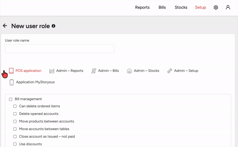 From the predefined roles, the app can be accessed by the owner role and manager role. If you also want to grant access to someone else, you can either create a new user role or copy one of the predefined ones. In the Storyous apps section, tick Has access to the Storyous app.