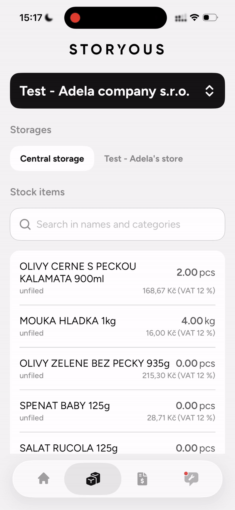 After logging in, you will see a screen with overviews of your venues. In the bottom bar you will see four icons – Venue overviews, Stock, Invoice history and Settings. We will go through them in more detail below.