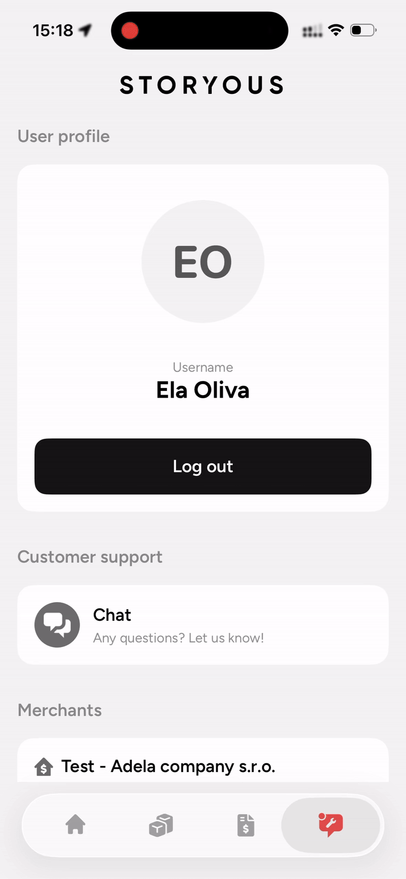 - the option to add another company using Add merchant +. Then just log in with your email and password and select the company you want to see in the app.