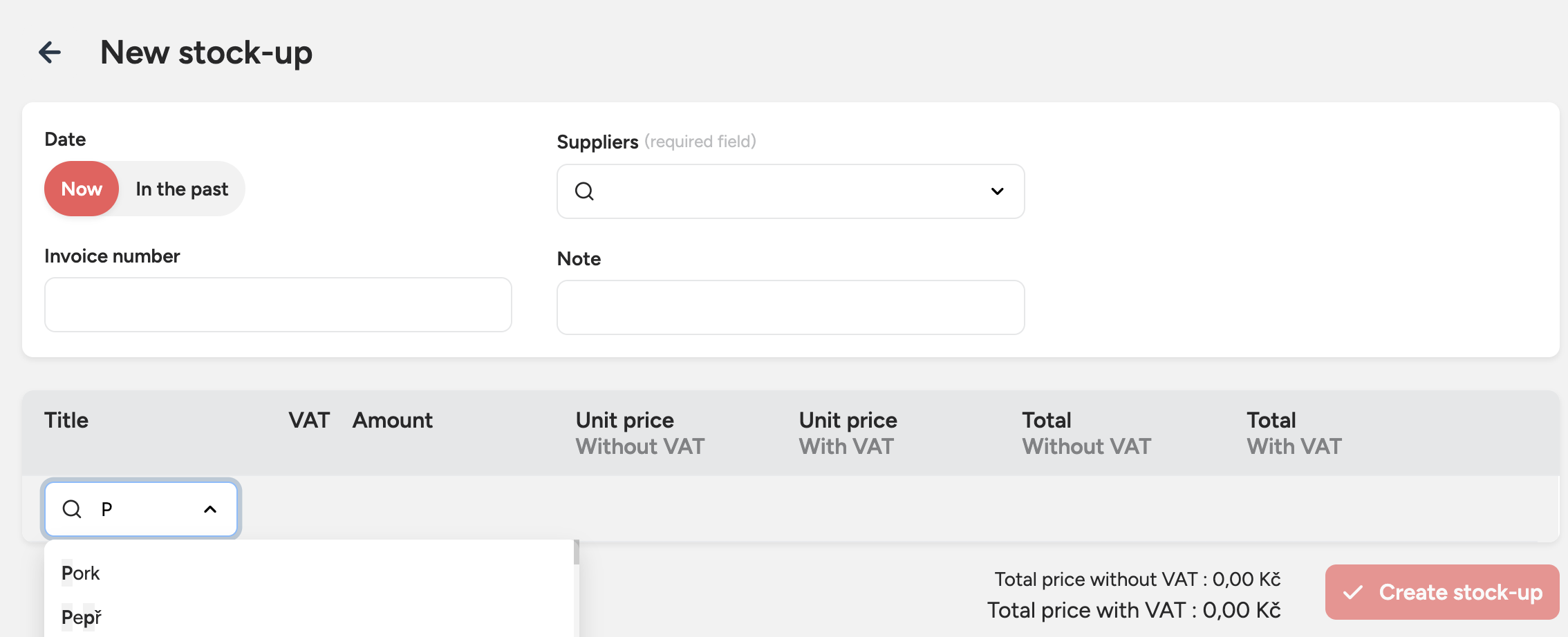 For a manual stock-up, you must manually enter the date. Stock entries can also be made for past dates. You will enter the document number and the supplier's name. If necessary, you can add any additional details in the Notes section.