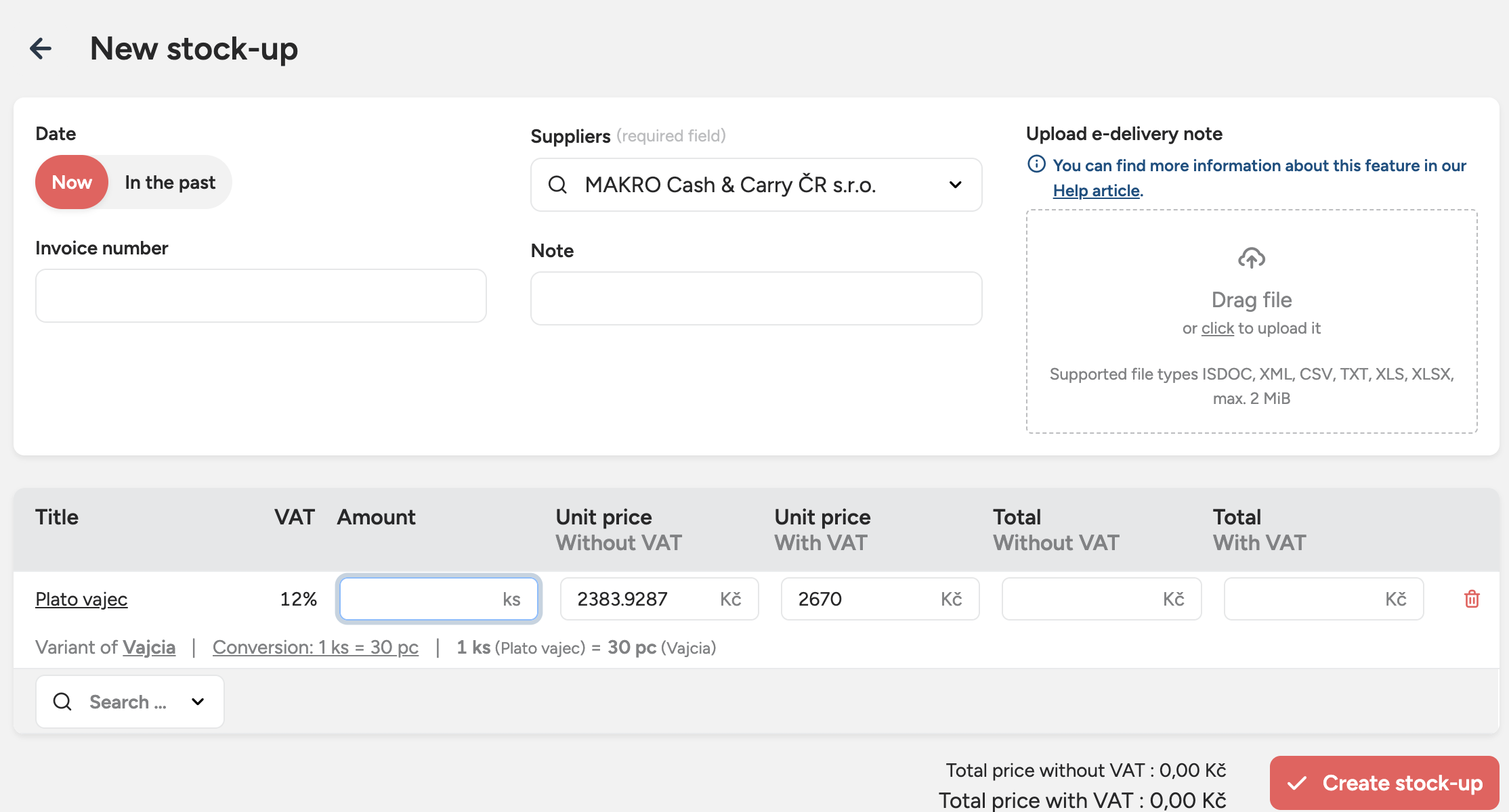 Automatic stock-up work by uploading an electronic delivery note provided by your supplier, instead of a traditional paper invoice. With automatic stock entry, all items are recorded without the need for manually entering individual stock cards, including quantities of materials.