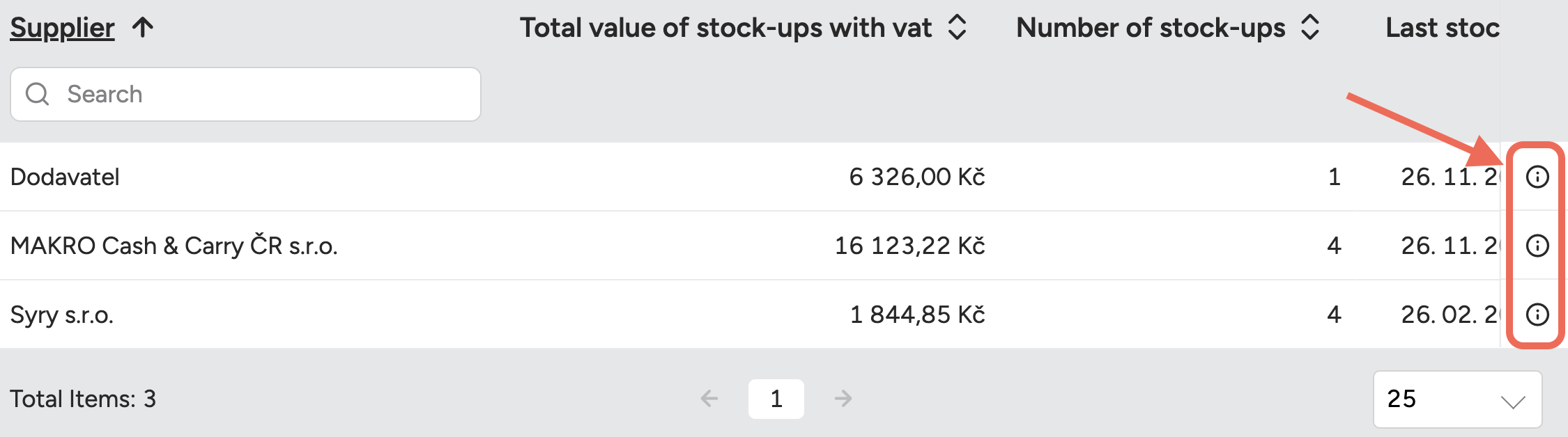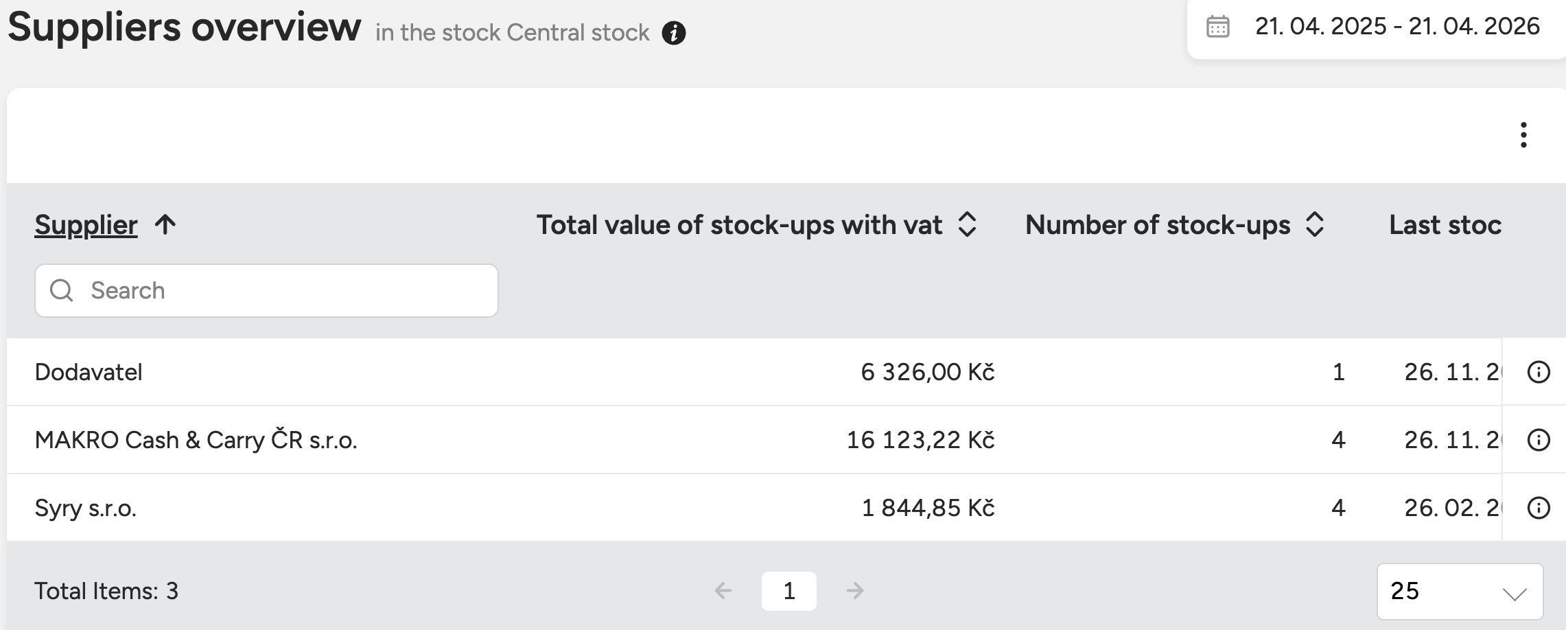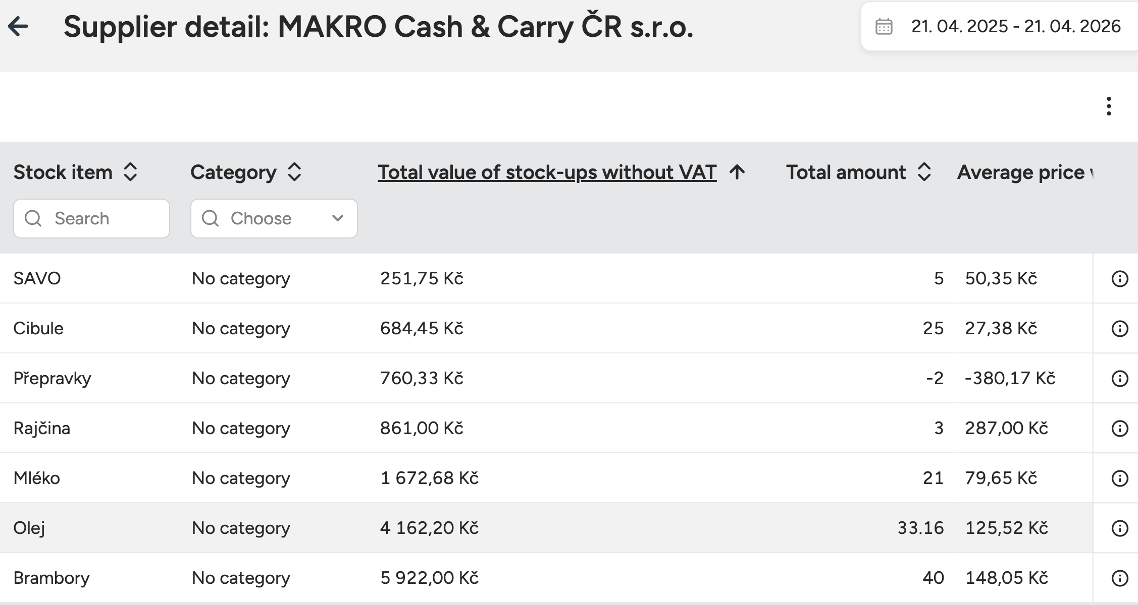 The supplier overview shows you in one place all the companies you trade with and the total value of goods and ingredients you have received from them. This helps you see more clearly how much you buy from each supplier and what the value of your purchases is.