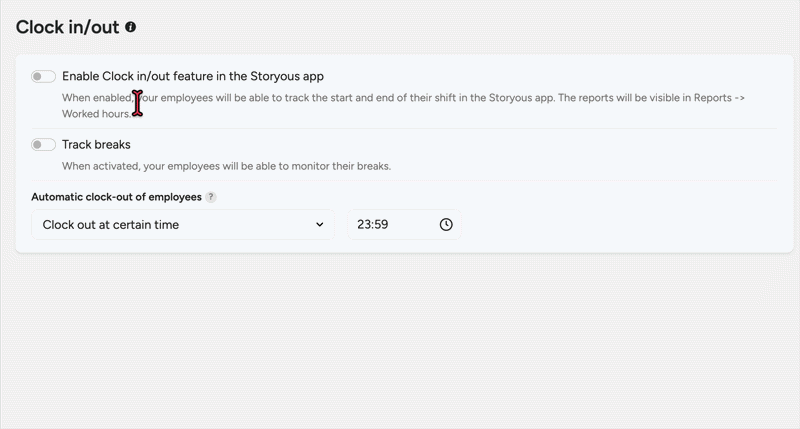 - Enable Clock in/out feature in Storyous app – turns the feature on on the till; you can also switch it off here.