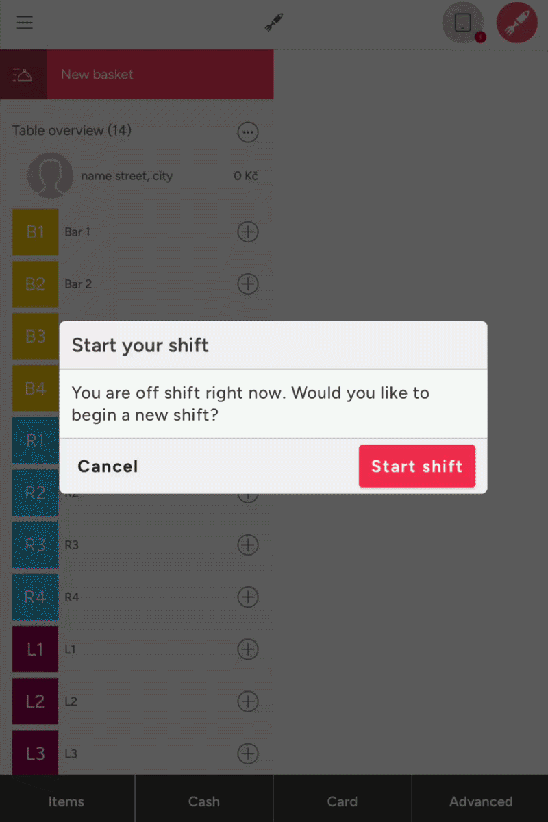 Once the feature is activated, the option for employees to sign in and sign out will appear in the Storyous app. After signing in, a window for Start your shift will appear, where you need to click Start shift, or you can start the shift by clicking Menu (≡ top left) and Start your shift under the user’s name.