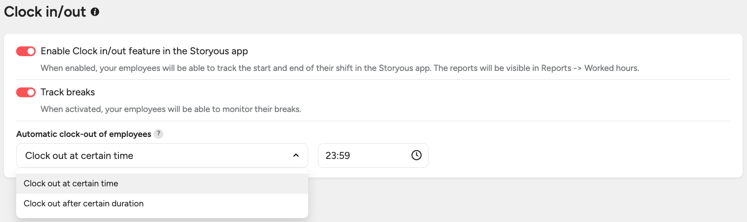 You can activate or deactivate the Employee Attendance feature in the settings: Settings → Clock in/out. If you disable it, the option to record arrivals and departures will not be available.
