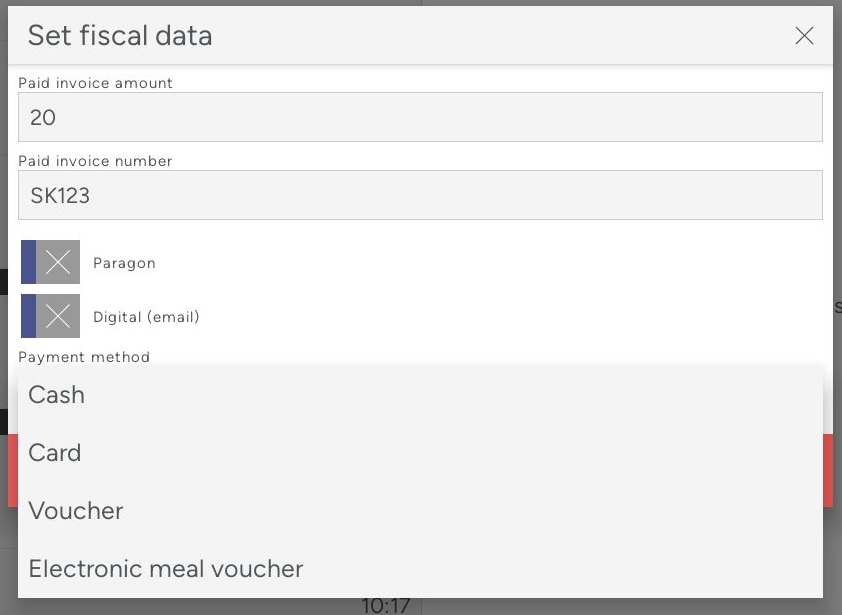 A form will appear where you need to fill in the amount of the paid invoice and the invoice number (which you can find on the invoice issued from your accounting system). You can enter the receipt sequence number or choose a digital confirmation (the payment confirmation will be sent by email). You can also select the payment method that was used to pay the invoice.