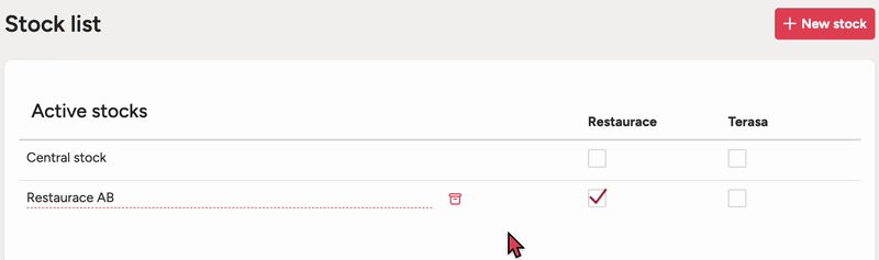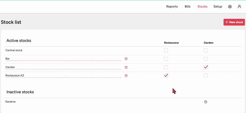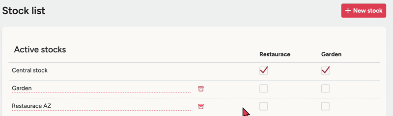 If you use multiple zones in your POS (for example a separate bar, kitchen or terrace), in the List of stocks table you simply tick, for each stock, which zone should deduct from it – all sales from this zone will then automatically reduce the stock in the selected stock.